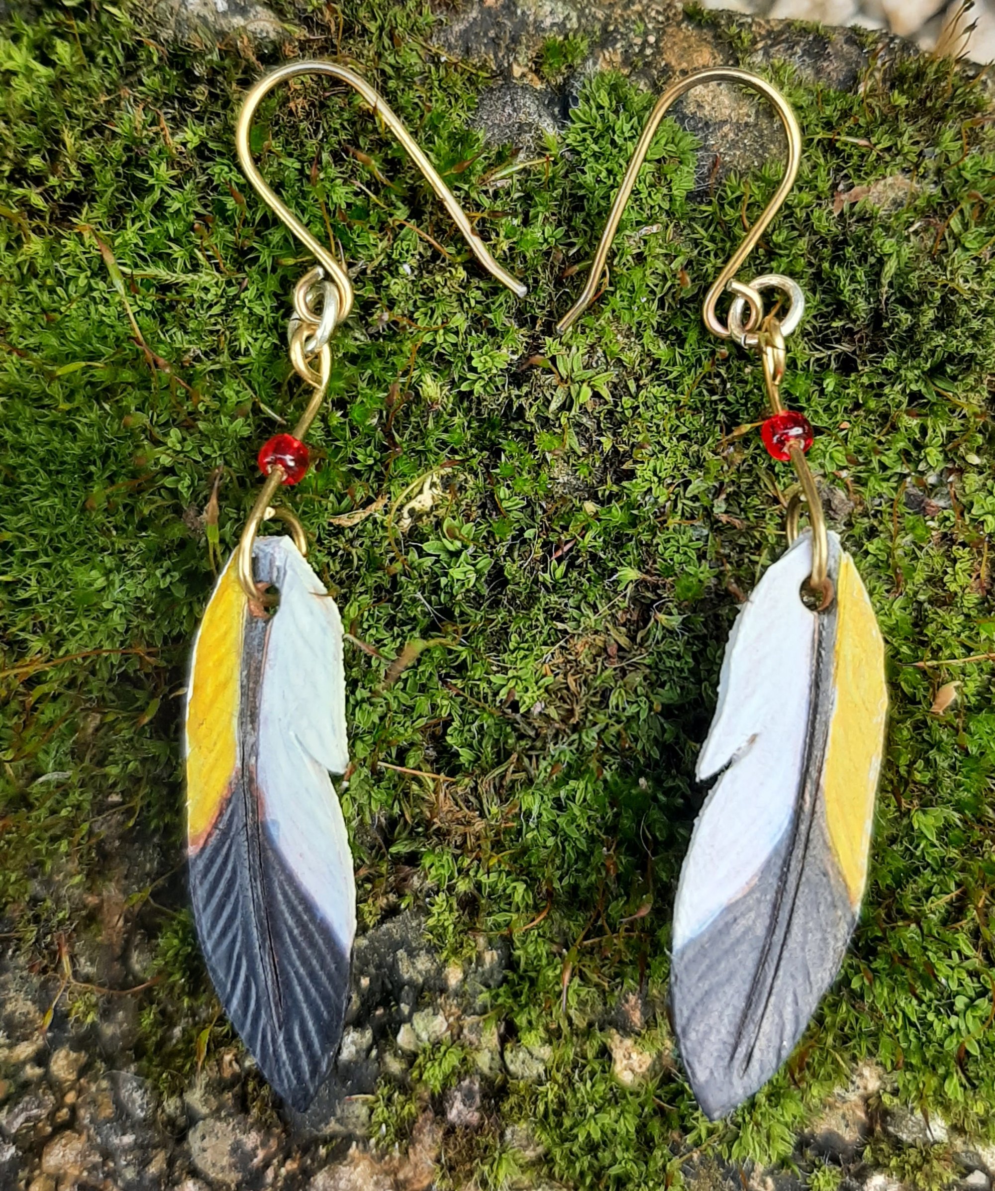 A pair of tiny leather goldfinch feather earrings