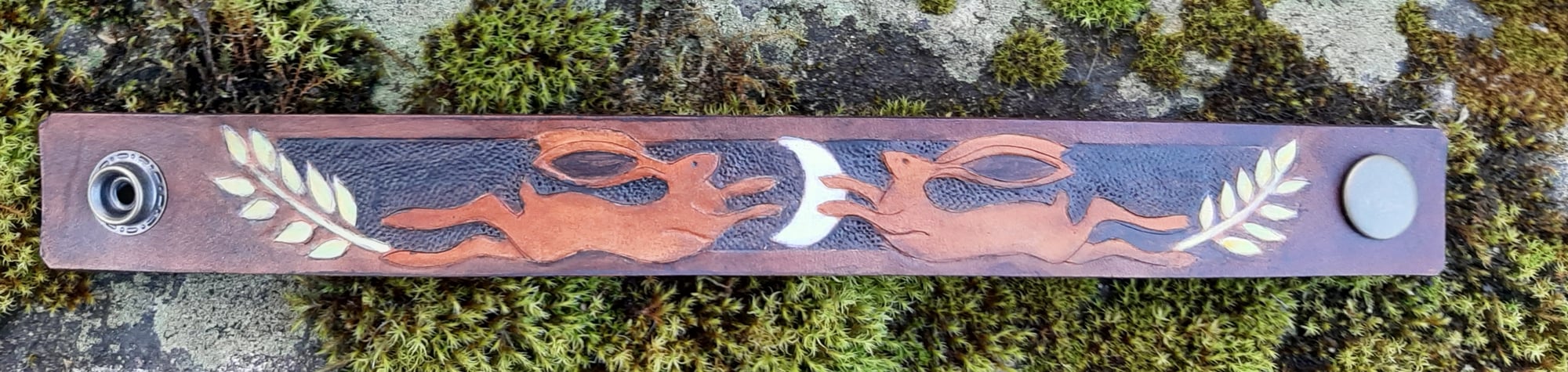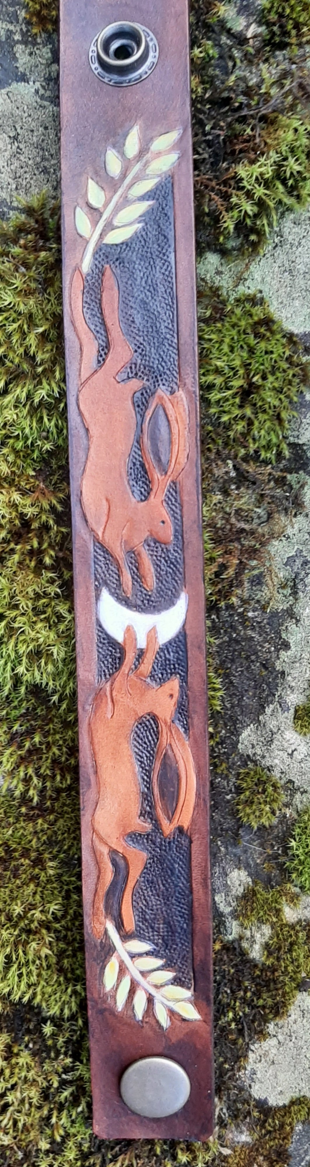 Leather wristband with leaping hares , waxing moon and ripening corn.