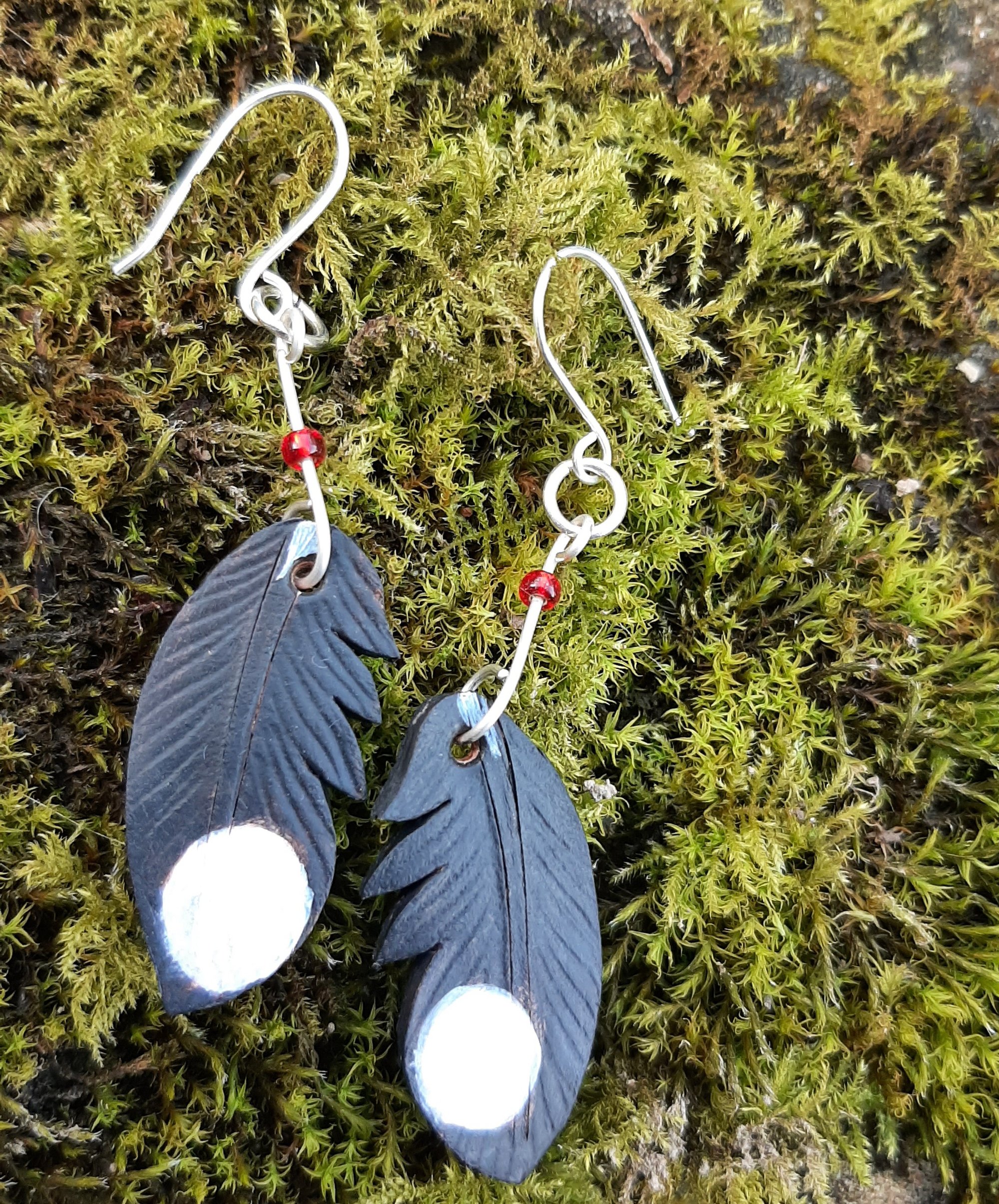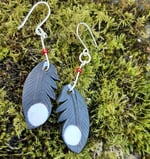 Tiny leather feather earrings- great spotted woodpecker